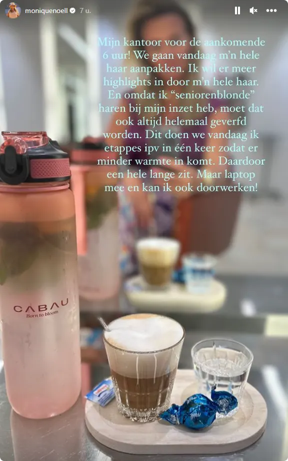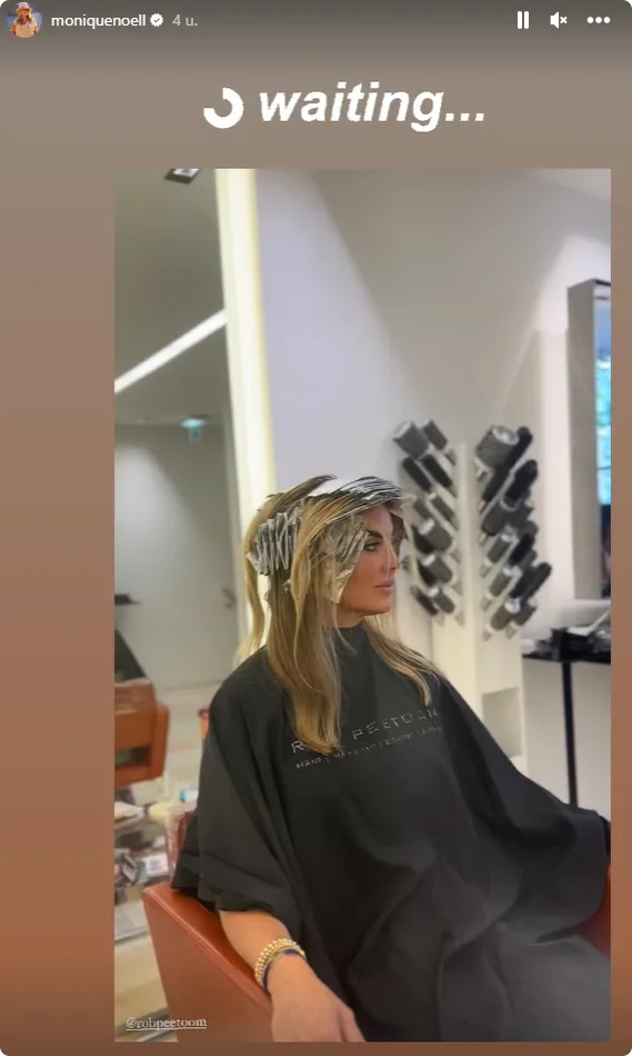 "Mijn kantoor voor de aankomende 6 uur!" schrijft Monique, wiens zoon ook al voor een nieuwe look ging (zie video), bij een foto van zichzelf. Wat gaat ze precies doen? "We gaan vandaag m'n hele haar aanpakken."
