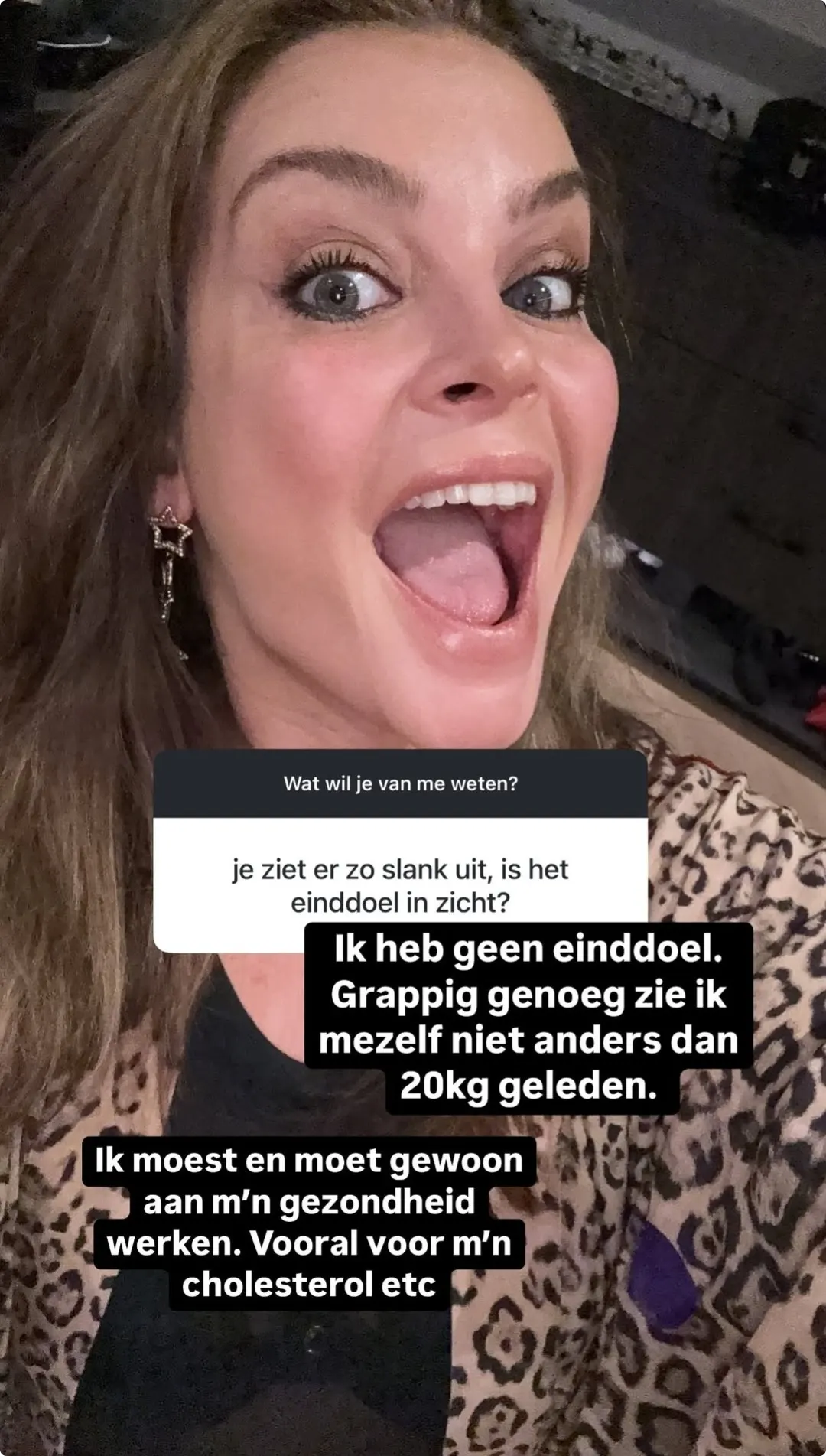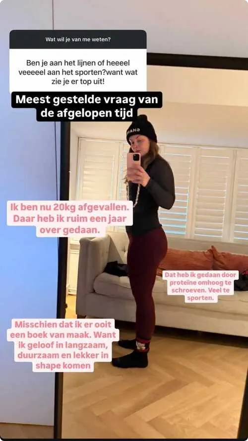 De 39-jarige tv-chef krijgt de laatste tijd steeds meer vragen over haar afvaltraject, vooral nu opvalt hoeveel ze wel niet is kwijtgeraakt de afgelopen tijd. Tijdens een vragenronde op haar Instagram Story lijkt haar gewichtsverlies dan ook het populairste onderwerp. Iemand vraagt bijvoorbeeld: "Ben je aan het lijnen of heeeel veeeel aan het sporten? Want wat zie je er top uit!"