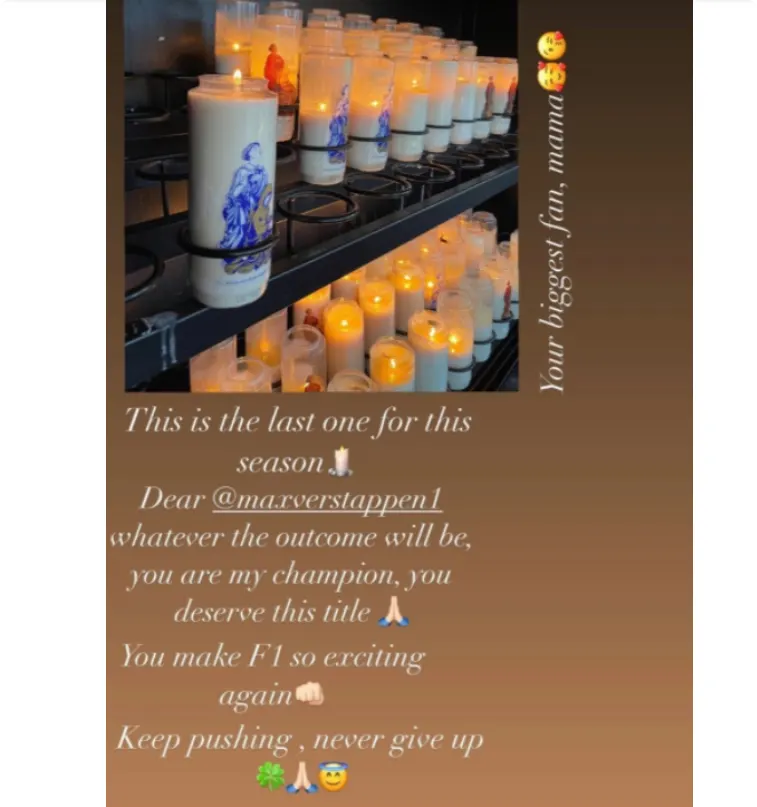 Op haar Instagram Stories deelt ze een foto van brandende kaarsen. Die steekt ze aan om Max succes te wensen en blijkbaar geregeld met succes.