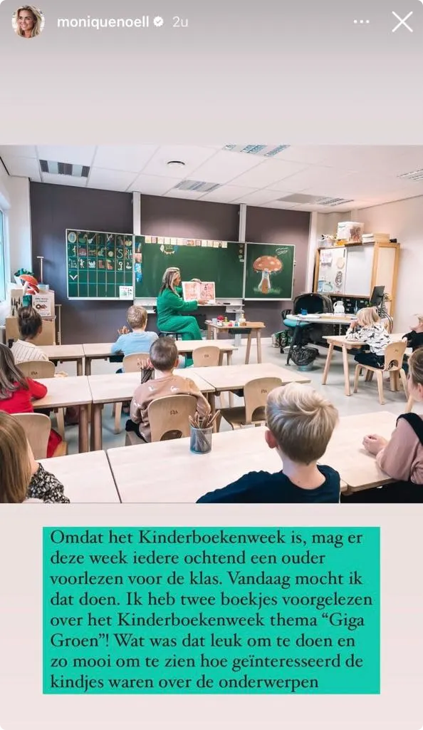 De blondine plaatst een foto op haar Instagram verhaal van haar voor de klas. "Omdat het Kinderboekenweek is, mag er deze week iedere ochtend een ouder voorlezen voor de klas vandaag mocht ik dat doen. Ik heb twee boekjes voorgelezen over het Kinderboekenweek thema 'Gi-ga-groen!'", schrijft ze bij de foto.