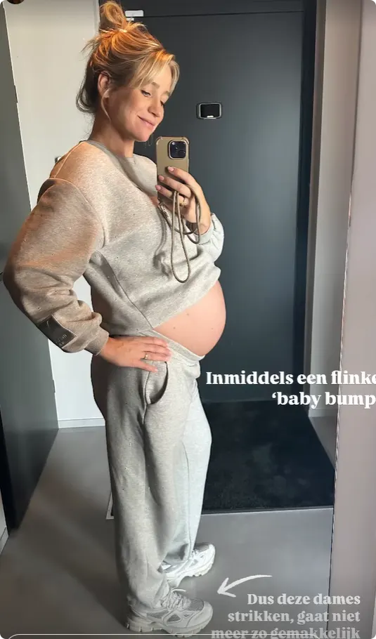 Ook toont de presentatrice haar "inmiddels flinke 'baby bump'" op een nieuwe foto. "Dus deze dames strikken, gaat niet meer zo gemakkelijk", verwijst ze naar haar schoenen.
