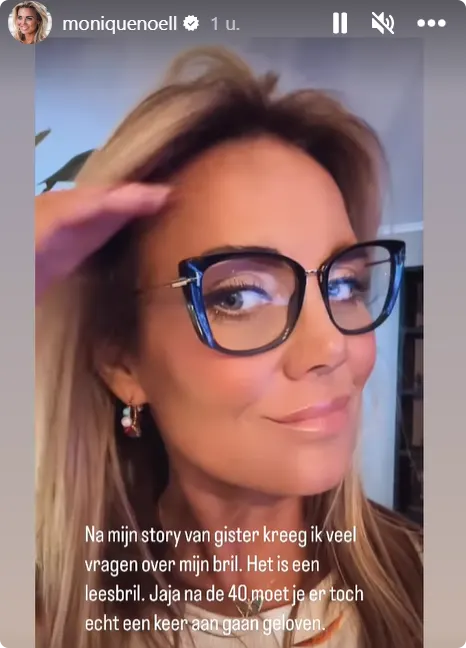 Monique Westenberg showt aan haar volgers hoe zij eruitziet met een bril op. Sinds kort heeft ze die namelijk nodig...