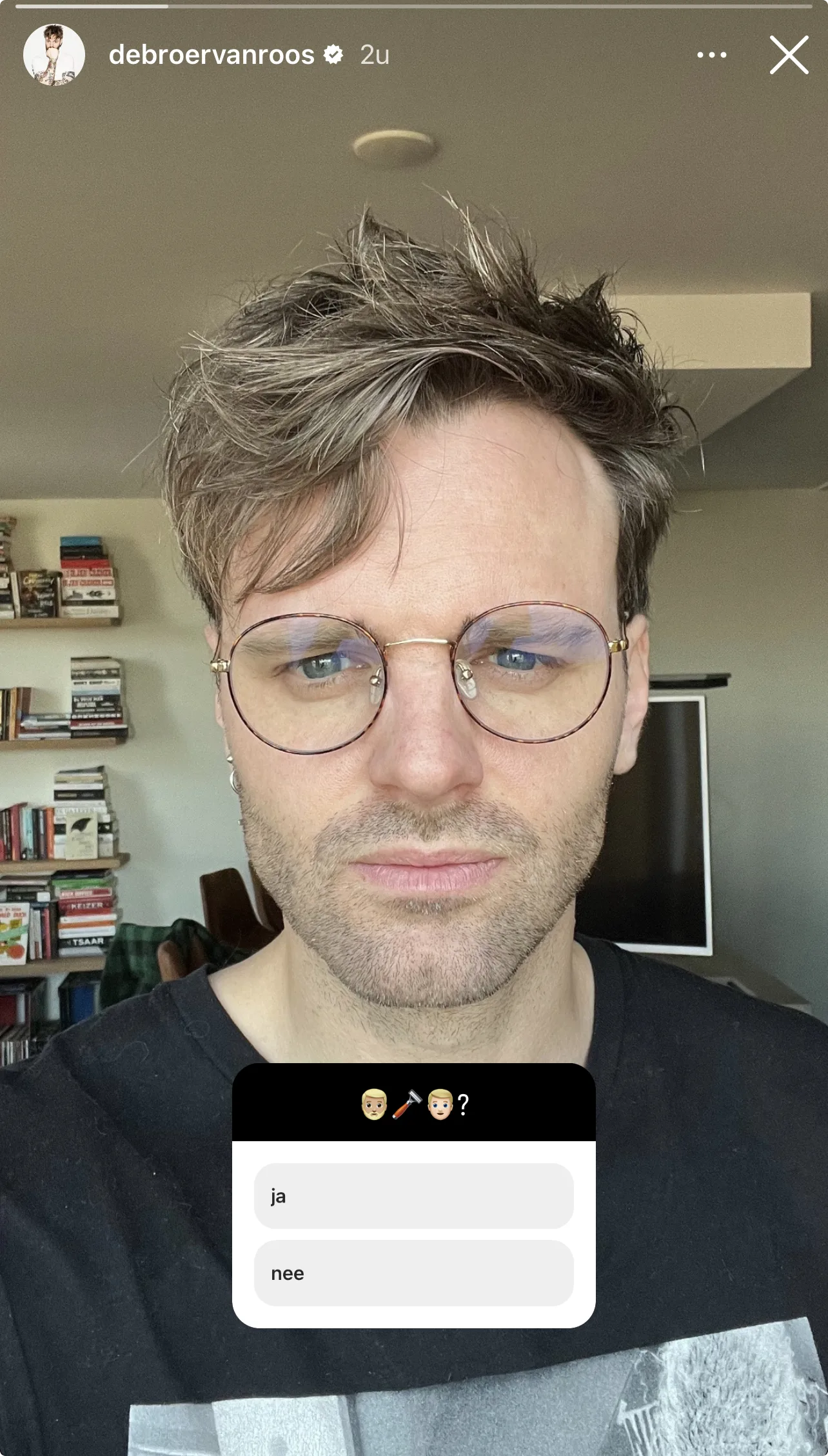 Tim deelt in zijn Instagram Stories een foto van zijn nieuwe look en vraagt zijn volgvers om hun mening. Te zien is dat hij niet zijn hele baard eraf heeft gehaald en wel nog stoppels heeft.
