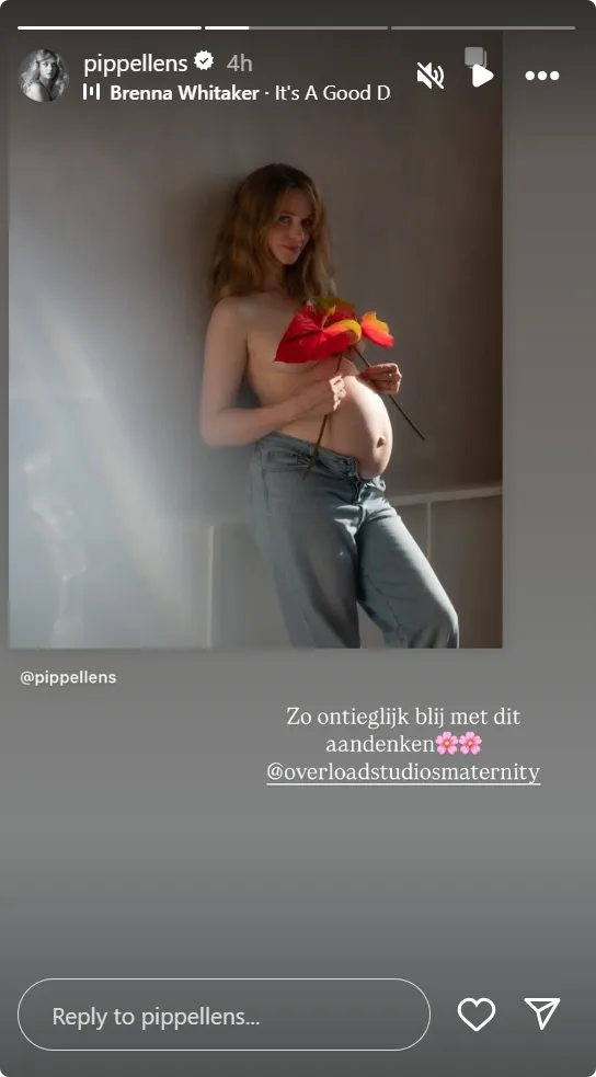 "Zo ontiegelijk blij met dit aandenken", schrijft Pip dankbaar bij een van haar zwangerschapsfoto's. Op haar Instagram-account deelt Pip verschillende foto's van de fotoshoot, waarin haar babybuik pronkt in het licht. De actrice bedekt haar voorgevel met twee roodoranje blaadjes, maar alle aandacht is duidelijk gevestigd op haar ontblote buik (zie onderstaande foto's).