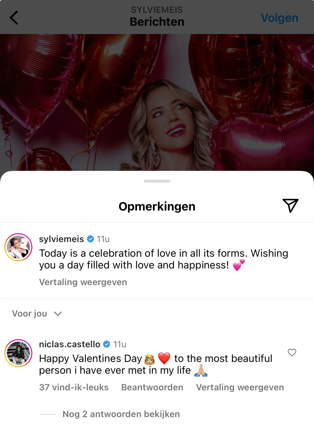In de reacties krijgt ze een hoop lieve berichten en één in het bijzonder. "Fijne Valentijnsdag aan de mooiste persoon die ik ooit in mijn leven heb ontmoet", laat haar ex-man Niclas Castello weten.