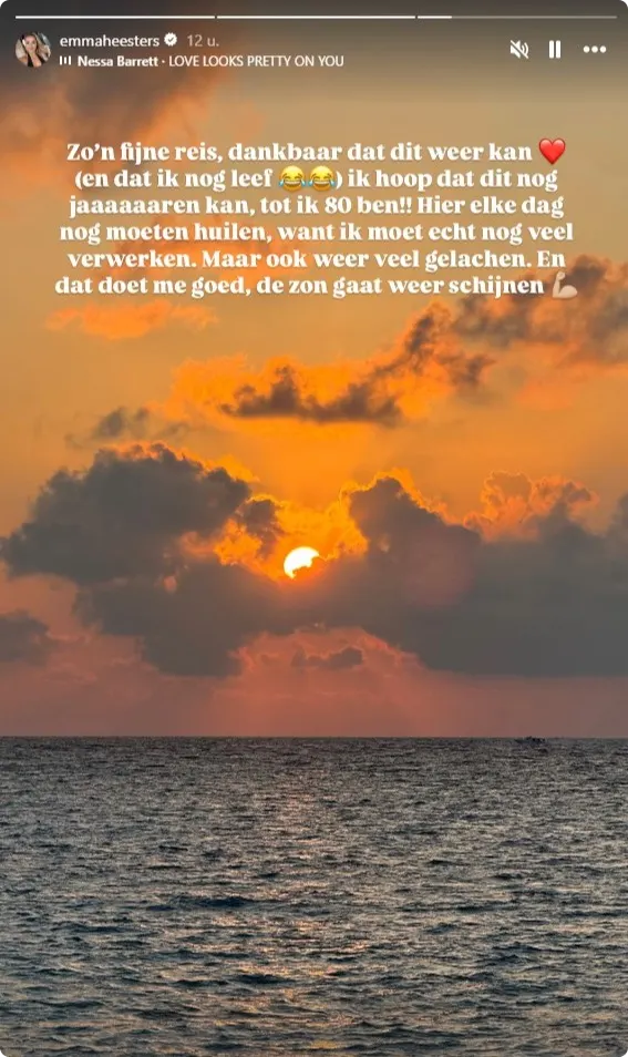 Donderdag liet Emma ook al van zich horen vanaf haar vakantieadres: "Ik ben de afgelopen tijd een aantal keer onder narcose geweest. Telkens als je 'in slaap valt' zeggen ze: denk aan iets leuks. Keer op keer koos ik deze vakantiebestemming", schreef ze in een bericht op Instagram. "Maanden heb ik in bed gekeken naar vakantiefilmpjes en gefantaseerd over hoe het zou zijn om weer te kunnen reizen en die vrijheid en kracht weer te hebben. Ik ben blij dat ik eindelijk mijn vakantiebestemming heb bereikt." Ze vertelt toen niet waar ze op vakantie is.