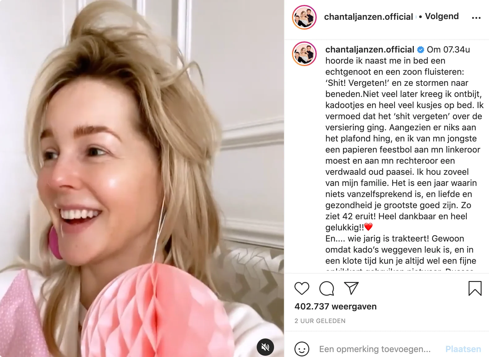Chantal deelt deze hilarische post en schrijft: "Om 07.34u hoorde ik naast me in bed een echtgenoot en een zoon fluisteren: ‘Shit! Vergeten!’ en ze stormen naar beneden.Niet veel later kreeg ik ontbijt, cadeautjes en heel veel kusjes op bed. Ik vermoed dat het ‘shit vergeten’ over de versiering ging. Aangezien er niks aan het plafond hing, en ik van mijn jongste een papieren feestbol aan mijn linkeroor moest en aan mijn rechteroor een verdwaald oud paasei. Ik hou zoveel van mijn familie. Het is een jaar waarin niets vanzelfsprekend is, en liefde en gezondheid je grootste goed zijn. Zo ziet 42 eruit! Heel dankbaar en heel gelukkig!!❤️"