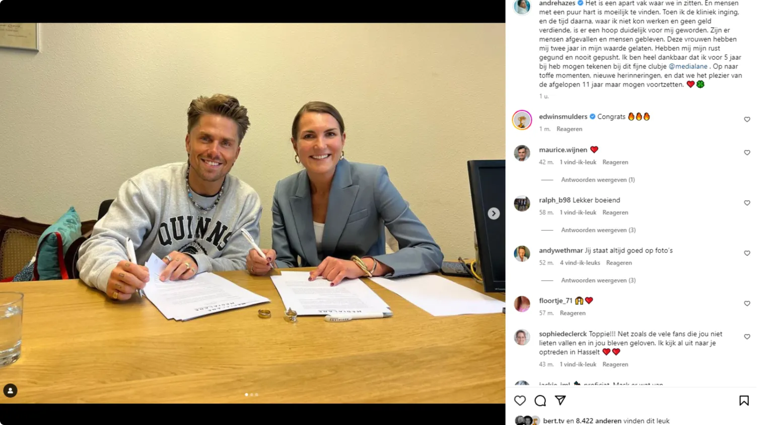 André Hazes heeft vijf jaar bijgetekend bij productiebedrijf MediaLane. Op Instagram deelt de zanger dat hij in "een apart vak" zit en dat het moeilijk is "mensen met een puur hart" te vinden.
