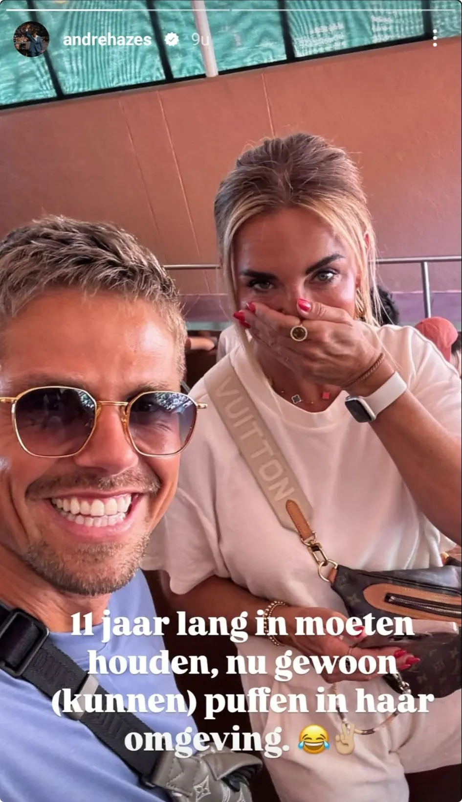 Op Instagram schrijft hij namelijk bij een foto waarop we zien dat Monique haar hand voor haar mond en neus houdt: "11 jaar lang in moeten houden, nu gewoon kunnen puffen in haar omgeving." André is daar zichtbaar blij mee, Monique een stukje minder.