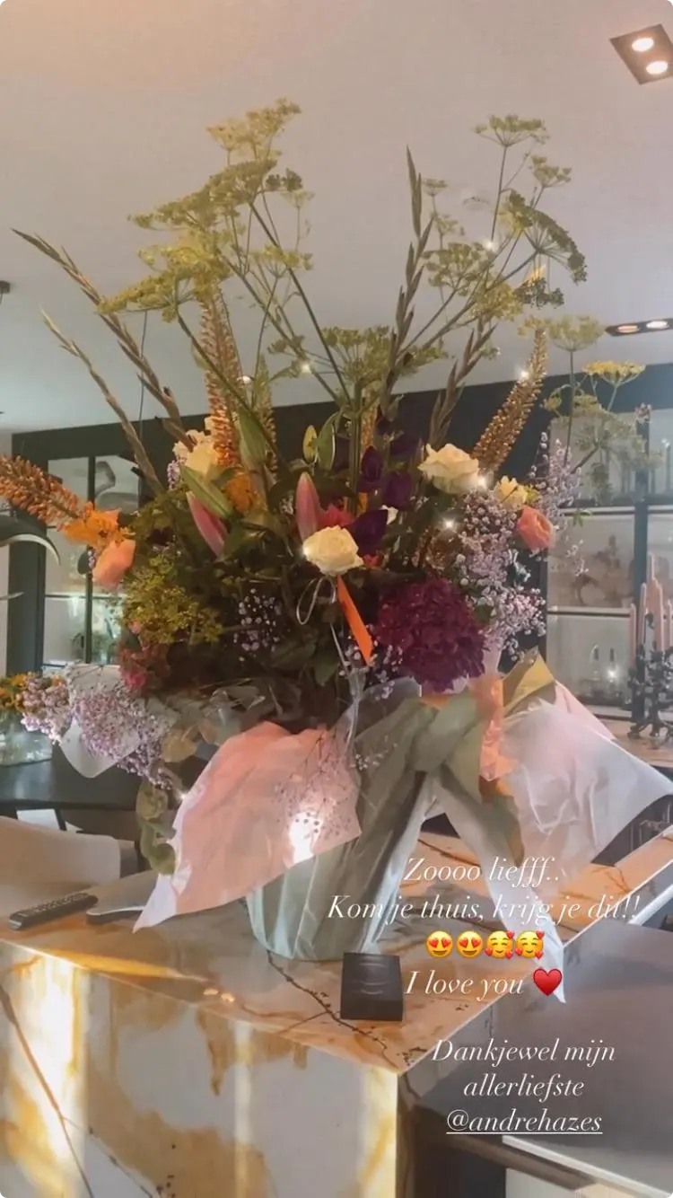 De 25-jarige Sarah plaatst een foto van een enorm boeket bloemen op Instagram, die ze als verrassing kreeg van André. "Zo lief. Kom je thuis en krijg je dit!! Ik hou van jou. Dankje @andrehazes"