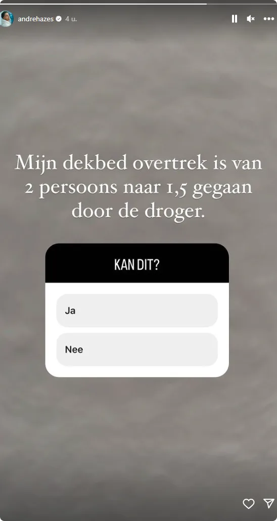 André heeft maandag zijn onderlaken in de droger gedaan, maar dat heeft helaas niet goed uitgepakt voor de zanger. "Van tweepersoons naar 1,5 gegaan", zo liet hij weten in zijn Instagram Stories. Hij vroeg aan zijn volgers of dit wel kan.