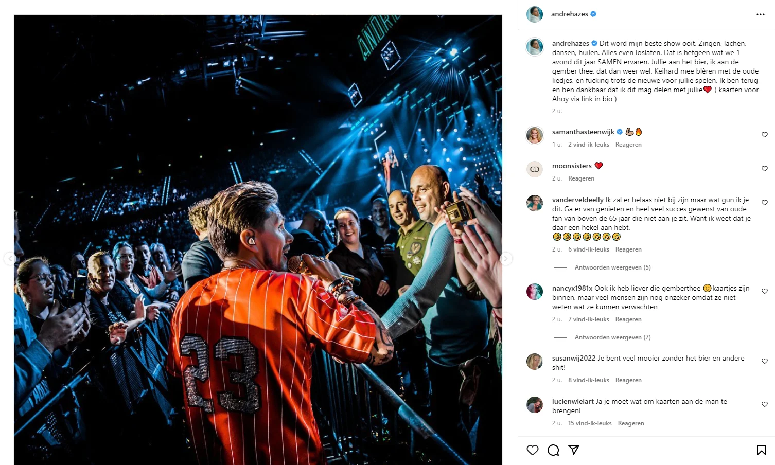 "Dit wordt mijn beste show ooit. Zingen, lachen, dansen, huilen. Alles even loslaten. Dat is hetgeen wat we 1 avond dit jaar SAMEN ervaren. Jullie aan het bier, ik aan de gember thee, dat dan weer wel", schrijft de zanger bij een foto van een concert. "Keihard mee blèren met de oude liedjes, en fucking trots de nieuwe voor jullie spelen."