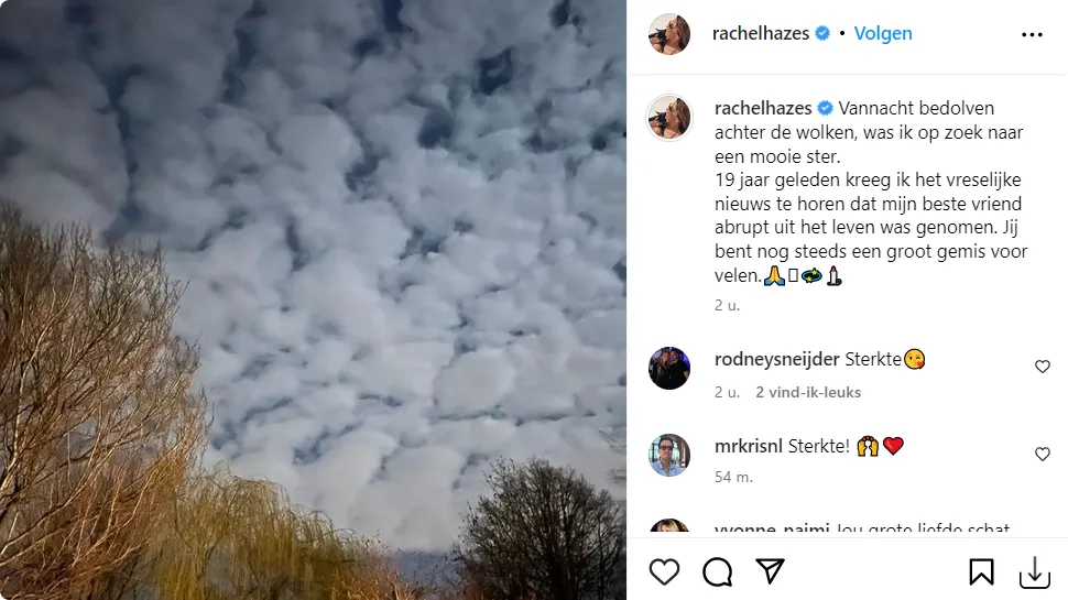 Op Instagram schrijft ze bij het grote gemis: "Vannacht bedolven achter de wolken, was ik op zoek naar een mooie ster. 19 jaar geleden kreeg ik het vreselijke nieuws te horen dat mijn beste vriend abrupt uit het leven was genomen. Jij bent nog steeds een groot gemis voor velen.🙏🥲💫🕯️."