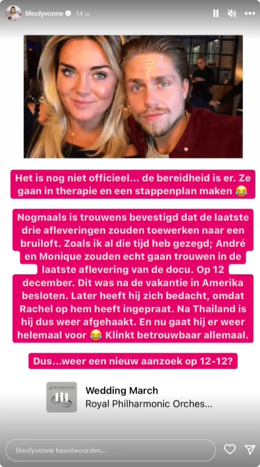 Evert Santegoeds vertelde maandagavond in Shownieuws dat Monique en André het hoogstwaarschijnlijk toch opnieuw samen gaan proberen. Zijn hele reactie is in de video hierboven te zien. Ook Yvonne Coldewijer meldde maandag in haar Instagram Stories dat er wel degelijk een liefdeshereniging in de lucht hangt, haar verhaal is hieronder te zien: