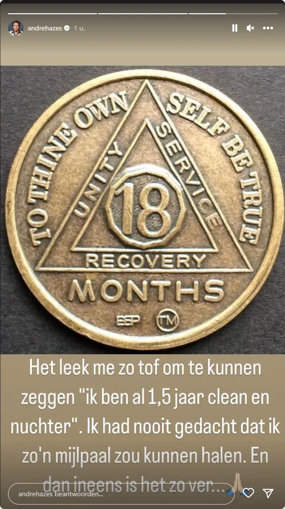 De zanger is enorm trots op zichzelf en schrijft dan ook bij een foto van zijn 'recovery munt' "Het leek me zo tof om te kunnen zeggen 'Ik ben al 1,5 jaar clean en nuchter'. Ik had nooit gedacht dat ik zo'n mijlpaal zou kunnen halen. En dan ineens is het zo ver...", aldus de 29-jarige Hazes bij de foto.