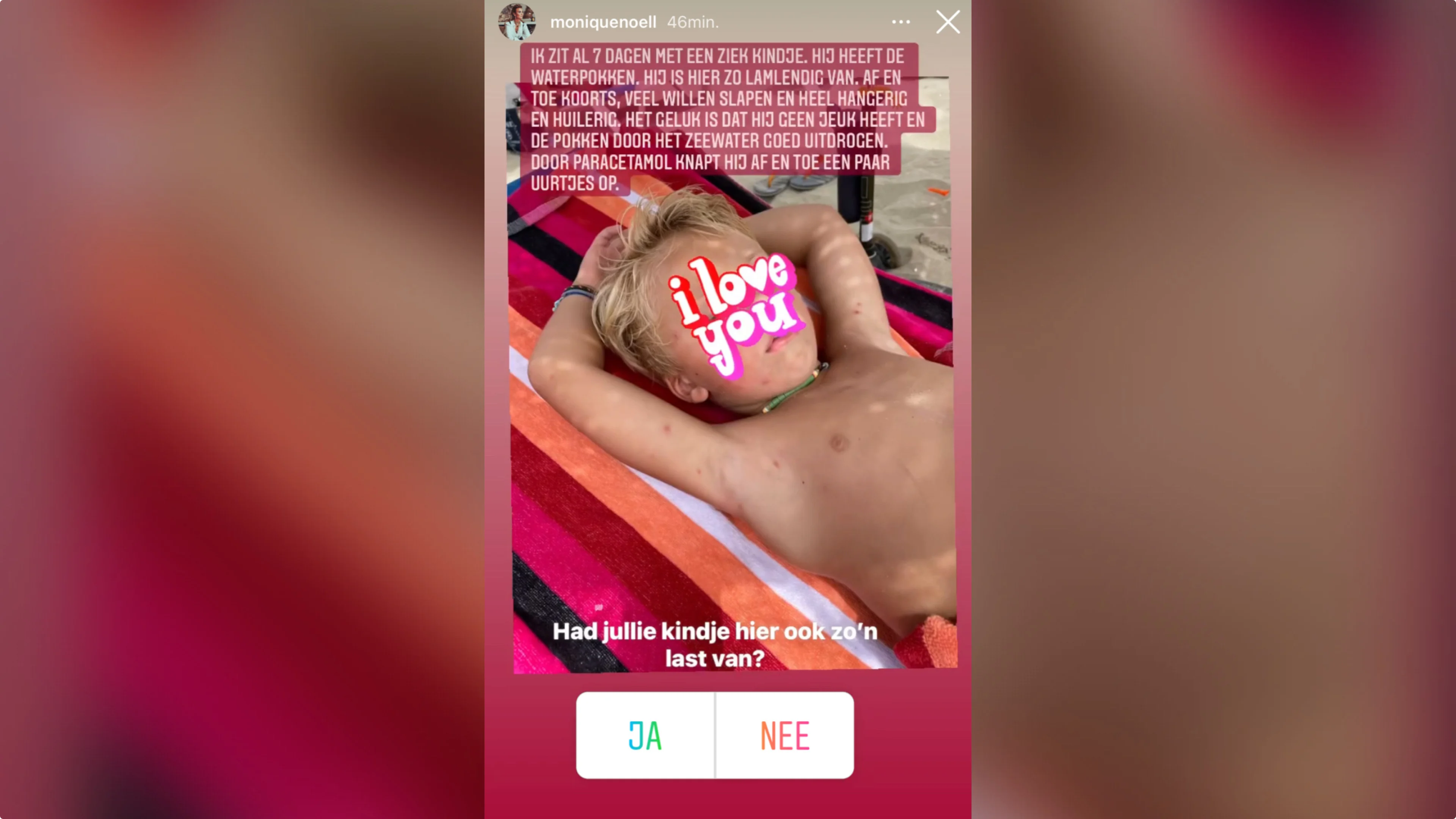 "Ik zit al zeven dagen met een ziek kindje", schrijft Monique op Instagram. André heeft namelijk de waterpokken. "Hij is hier zo lamlendig van. Af en toe koorts, veel willen slapen en heel hangerig en huilerig." De bezorgde mama vraagt haar Instagramfans of ze dit herkennen. "Had jullie kindje hier ook zo'n last van?"