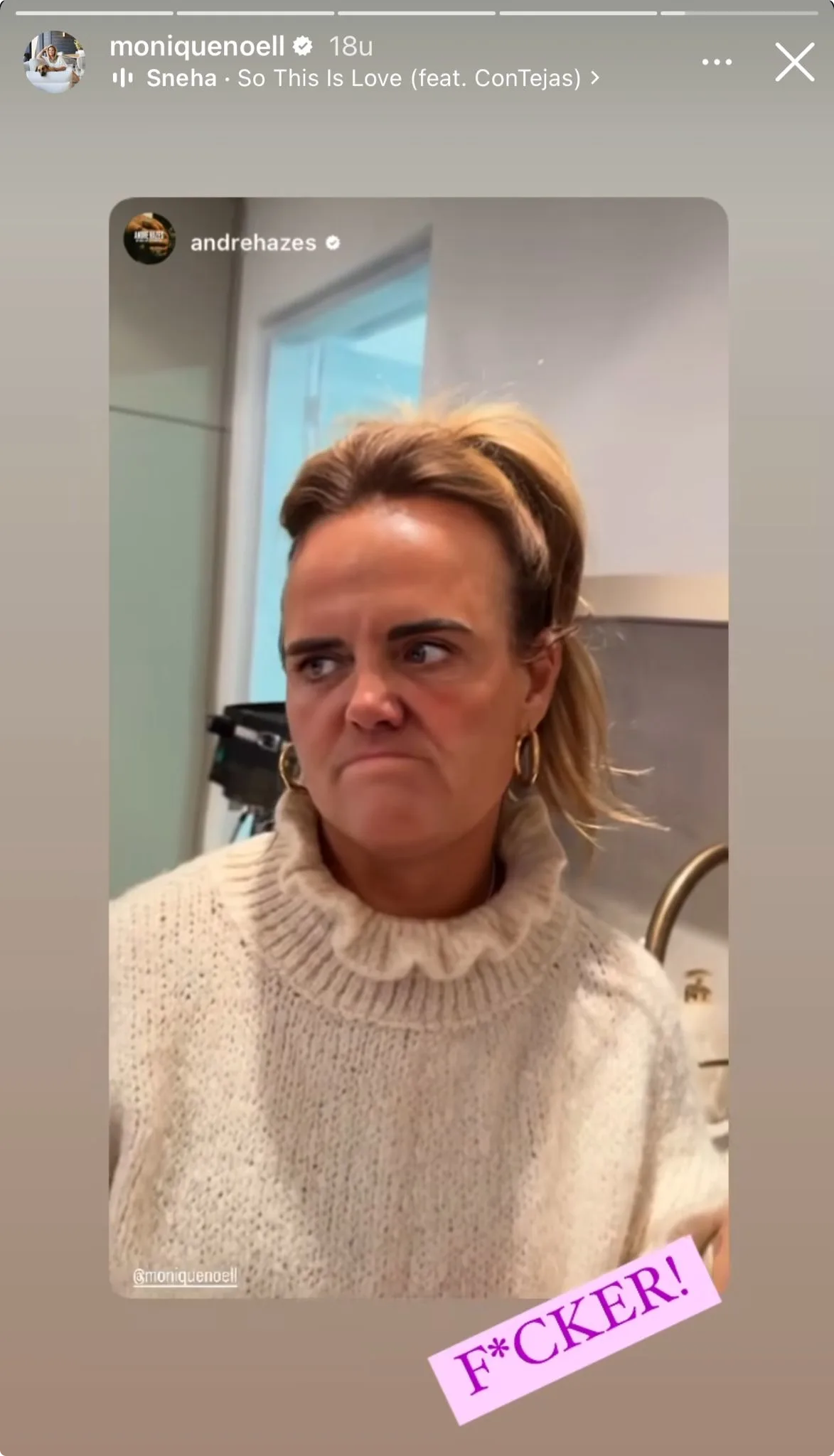 Monique dacht dat André een lief filmpje van haar maakte, want door zijn speakers was de tekst "so this is love" te horen, maar niets bleek minder waar: de zanger had een gekmakend filter aangezet. Deze beelden deelt hij met zijn volgers en Monique herplaatst ze met de tekst: "F*cker!"