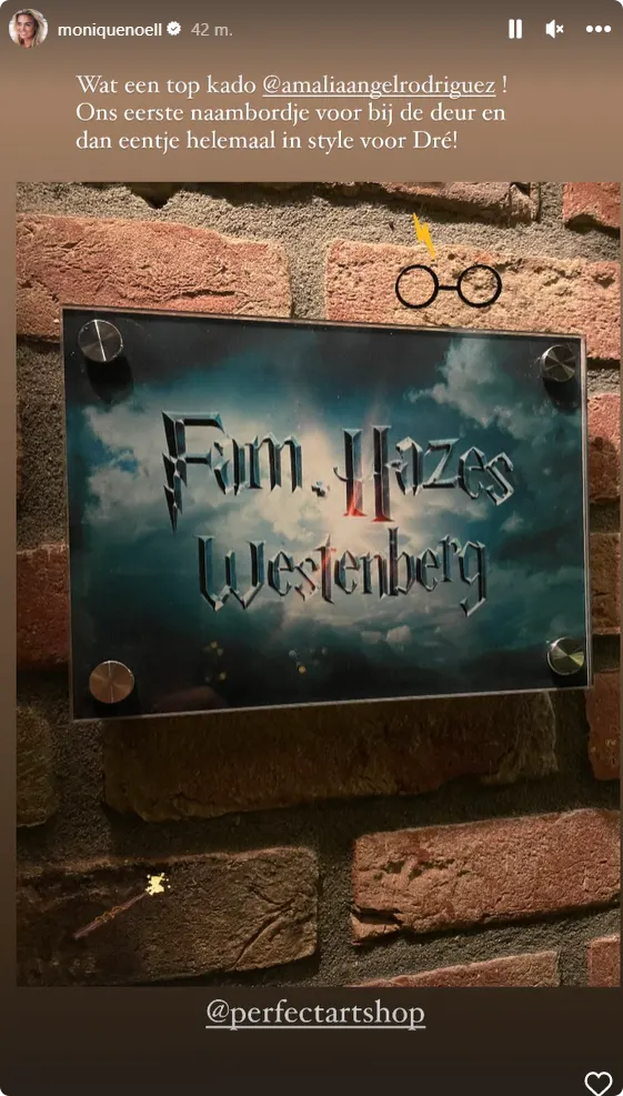 Op haar social media deelt Monique een foto van het speciaal gemaakt naambordje van haar huis. "Wat een topcadeau", schrijft ze op Instagram. "Ons eerste naambordje voor bij de deur en dan eentje helemaal in style voor Dré."