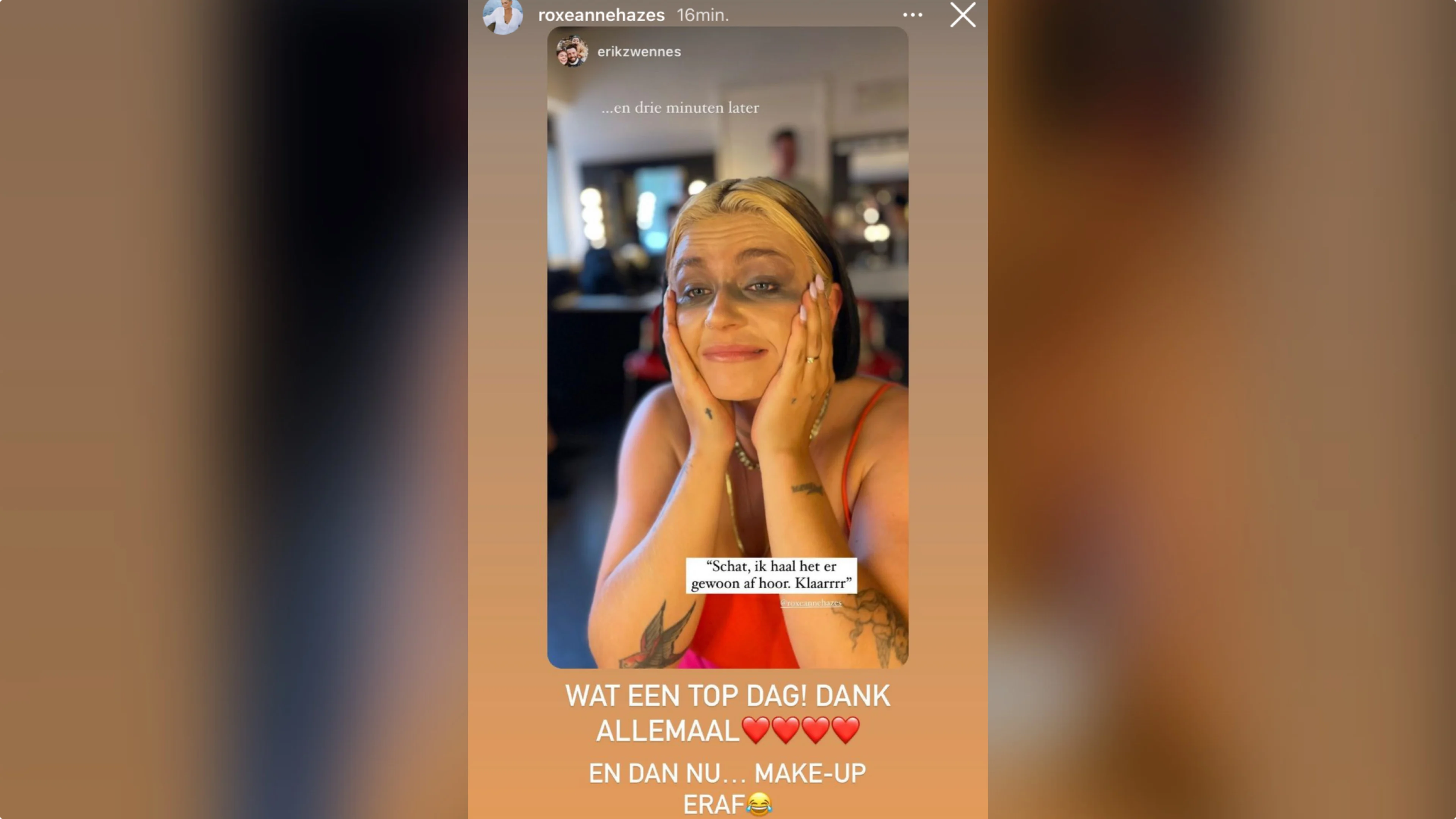 "Wat een top dag! Dank allemaal. En dan nu... Make-up eraf", schrijft Roxeanne bij de foto van de - hoe zullen we het noemen? - 'panda-look'.