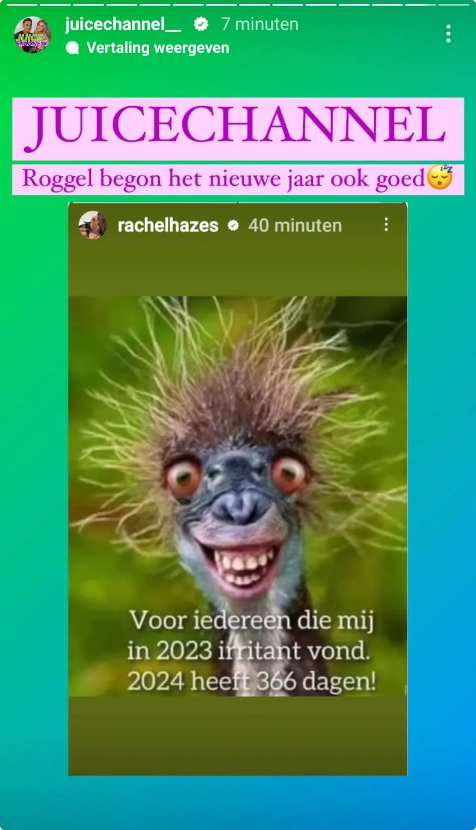 Rachel begint dit jaar door zich uit te laten naar de mensen die geen fan van haar zijn. "Voor iedereen die mij in 2023 irritant vond. 2024 heeft 366 dagen!", staat op haar story met een plaatje van een bijzonder wezen.