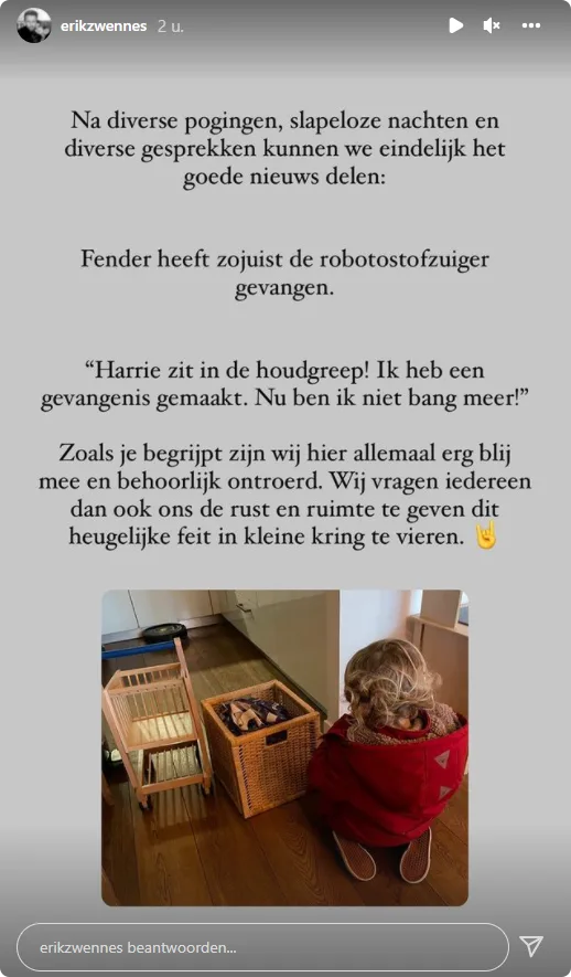 In een Instagram-post van Erik legt hij haarfijn uit wat de reden was van de slapeloze nachten. "Harrie zit in de houtgreep! Ik heb een gevangenis gemaakt. Nu ben ik niet meer bang", verwijst Erik naar zijn zoontje Fender die nu niet meer bang is en hoeft te zijn.