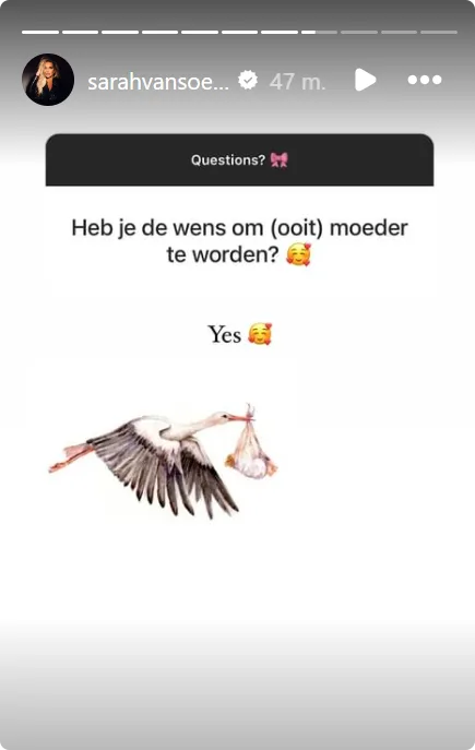 Sarah van Soelen, voormalige vriendin van André Hazes (zie video), heeft donderdag op haar Instagram een vragenronde gehouden waarin ze vragen van haar volgers beantwoordt en meer over zichzelf deelt... Tijdens deze interactieve sessie werd haar onder andere gevraagd of ze ooit de wens heeft om moeder te worden. Hierop reageerde ze met een schattige foto van een ooievaar en een kort maar krachtig antwoord: "Yes!"