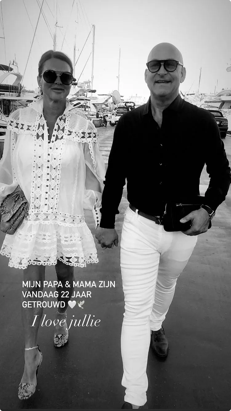 De 25-jarige influencer plaatst een foto van haar ouders, en schrijft erbij: "Mijn papa en mama zijn vandaag 22 jaar getrouwd. I love jullie."