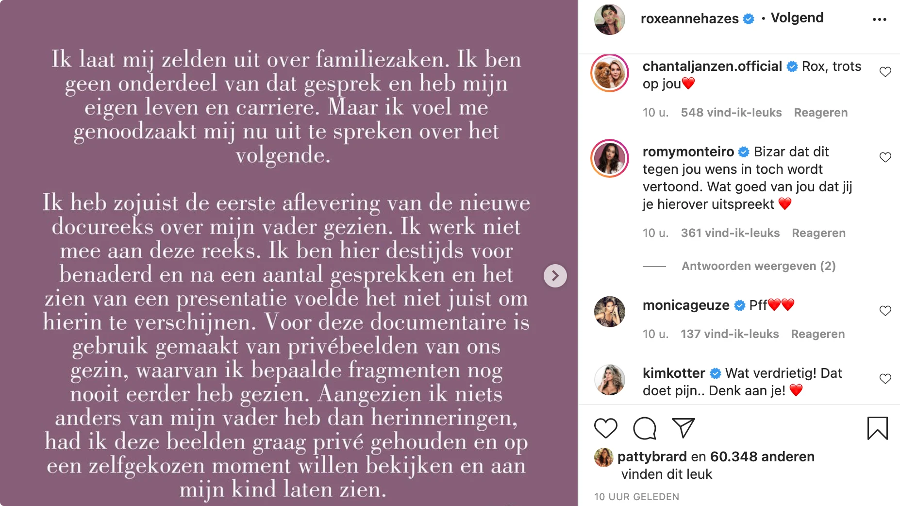 Roxeanne Hazes kreeg woensdagavond op sociale media veel steun na haar boze reactie op het gebruik van privébeelden in een documentaire over haar vader zonder dat zij daar toestemming voor had gegeven.