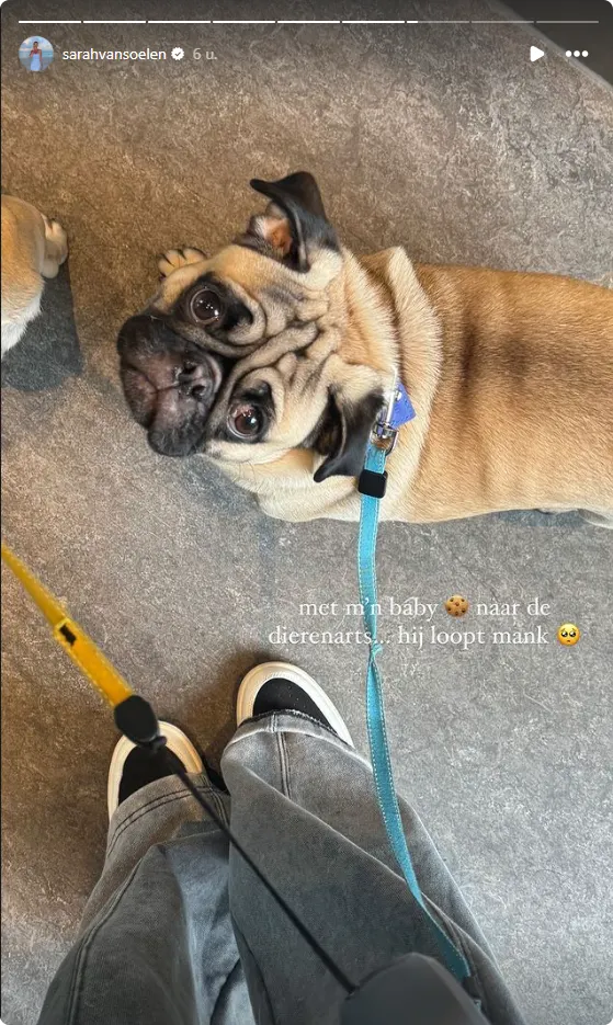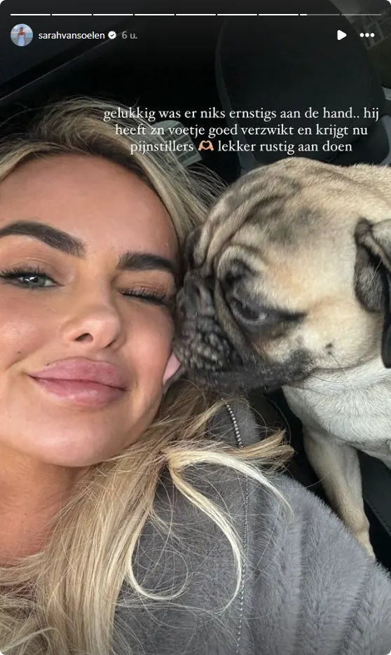 Later geeft Sarah een update over de gezondheid van het hondje, en ze is opgelucht door het nieuws: "Gelukkig was er niks ernstigs aan de hand. Hij heeft z'n voetje goed verzwikt en krijgt nu pijnstillers. Lekker rustig aan doen!"