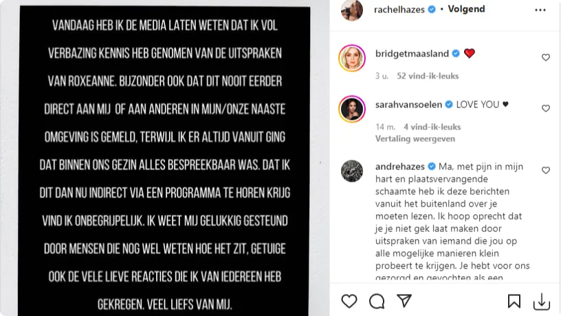 Rachel reageerde op Instagram "vol verbazing" op de uitspraken die haar dochter Roxeanne deed in de uitzending van Beste Zangers donderdagavond. "Bijzonder ook dat dit nooit eerder aan mij of aan andere in mijn/onze naaste omgeving is gemeld", schreef Rachel onder meer. En ook: "Dat ik dit dan nu indirect via een programma te horen krijg vind ik onbegrijpelijk. Ik weet mij gelukkig gesteund door mensen die nog wel weten hoe het zit, getuige ook de vele lieve reacties die ik van iedereen heb gekregen."
