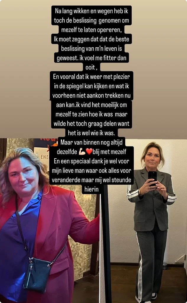 Op Instagram laat ze zien dat ze na de ingreep ontzettend is afgevallen en ze schrijft dat ze zich "fitter dan ooit" voelt. Onder meer Roxeanne reageert en schrijft onder haar post: "Zussie!" Monique, de vriendin van André, reageert met een hartje.