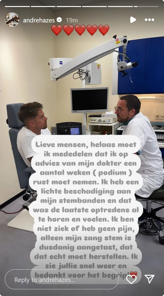 André Hazes moet een aantal weken verplicht rust nemen. De zanger heeft "een lichte beschadiging" aan zijn stembanden en kan daardoor niet optreden, meldt hij woensdag in zijn Instagram-story (zie video).