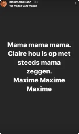 Maar Claire laat het er niet bij zitten. Ze mag dan wel geen mama meer zeggen, maar dit toch zeker wel? "Maxime, Maxime, Maxime", zegt ze creatief.