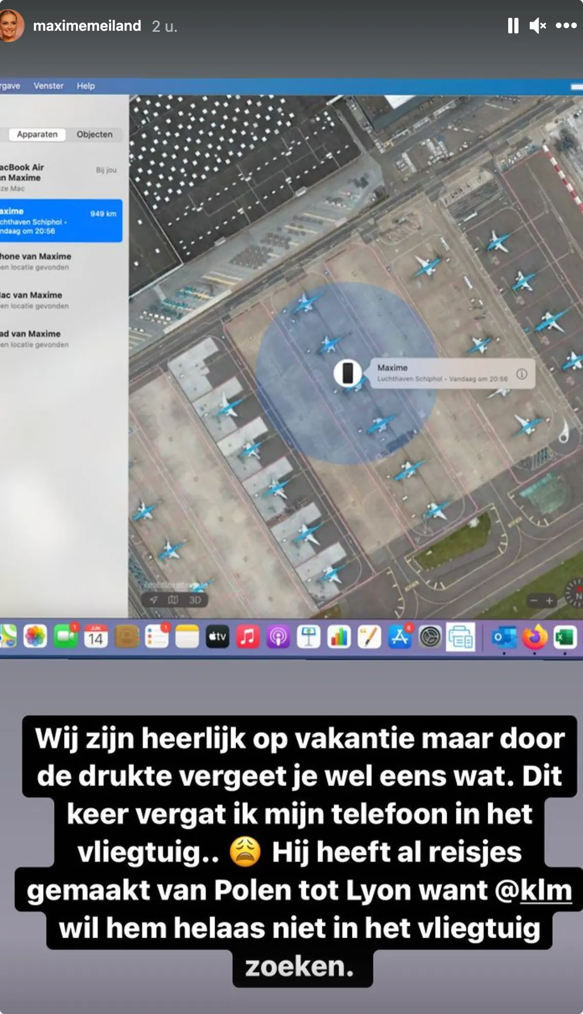 Dinsdag liet een radeloze Maxime weten dat ze haar telefoon was vergeten in een KLM- vliegtuig. In haar Instagram Stories vertelde ze ook dat de vliegtuigmaatschappij haar mobieltje niet wilde gaan zoeken. De zoekfunctie van haar telefoon is ingeschakeld waardoor ze het toestel wel kan volgen. "Hij heeft al reisjes gemaakt van Polen tot Lyon", schreef ze.