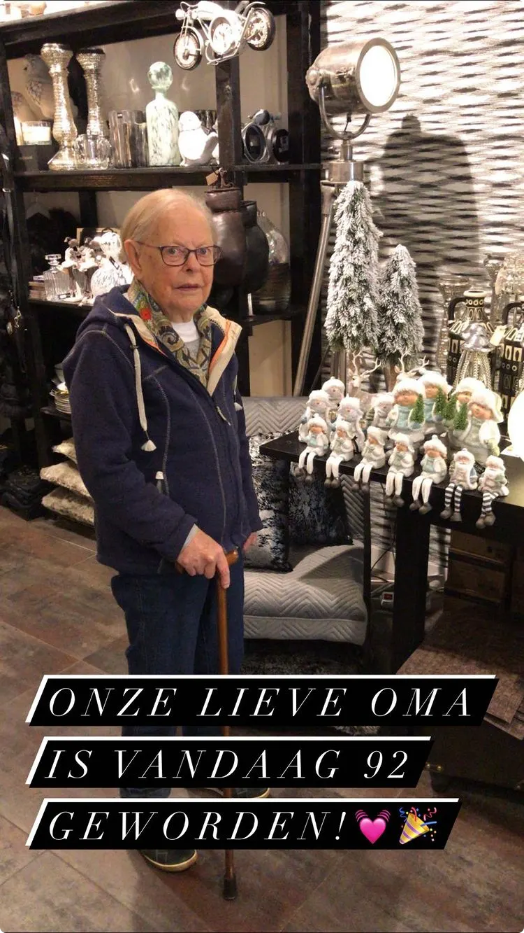 Op social media staat kleindochter Maxime stil bij haar geboortedag. Zo deelt Maxime een foto van haar oma in haar Instagram Stories. Ze schrijft daarbij: "Onze lieve oma is vandaag 92 jaar geworden!" Gefeliciteerd!