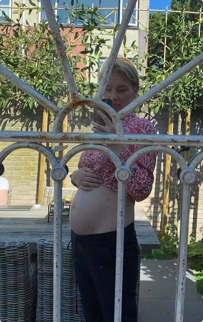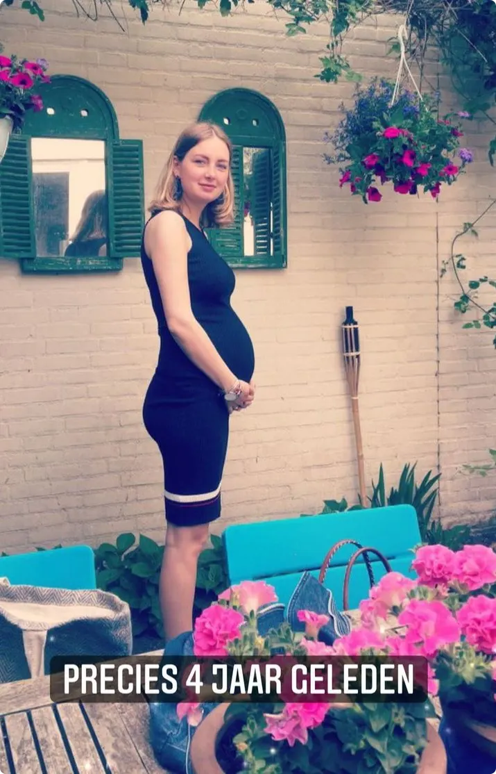 In haar Instagram Stories deelt ze onderstaande foto van 4 jaar geleden, toen ze in verwachting was van Claire. En op deze foto had ze een flinke babybuik.