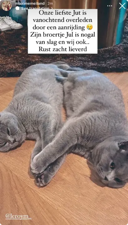 In april 2021 maakten Maxime, Leroy en Claire bekend twee Britse korthaar kittens in huis te nemen. Ze noemden ze Jut en Jul, zo vertelde Maxime toen al aan Shownieuws. Ook deelde ze de schattige eerste beelden van de twee kittens en die zijn in onderstaande video te zien.