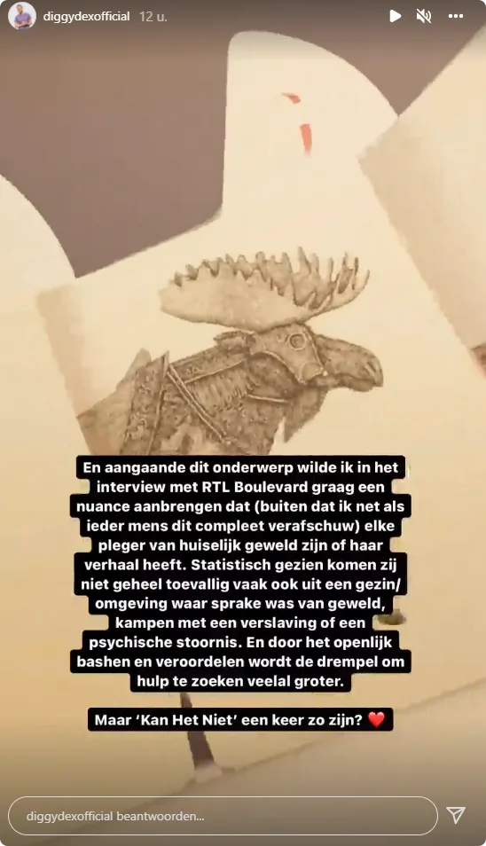 "Aangaande dit onderwerp wilde ik graag een nuance aanbrengen" aldus Diggy. "(Buiten dat ik net als ieder mens dit compleet verafschuw) dat elke pleger van huiselijk geweld zijn of haar verhaal heeft". De muzikant schrijft dat statistisch gezien plegers van huiselijk geweld zelf vaak ook uit een gezin of omgeving komen waar sprake was van geweld, verslaving of een psychische stoornis. "Door openlijk te bashen en te veroordelen wordt de drempel om hulp te zoeken veelal groter", aldus Diggy.