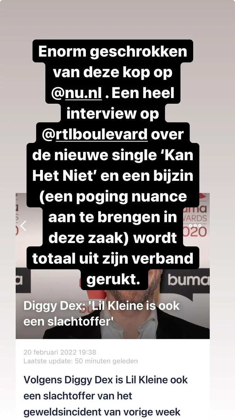 Diggy Dex sprak met RTL Boulevard over zijn nieuwe single 'Kan Het Niet'. In hetzelfde interview liet hij zich uit over de van mishandeling verdachte Lil' Kleine. Diggy Dex probeert naar eigen zeggen wat nuance aan te brengen in deze zaak en stelde: “Het slachtoffer is Jaimie, maar ik denk – in dit geval – dat Lil Kleine zelf ook een slachtoffer is en dat geldt in alle gevallen ook. Weet je wel, dat de dader vaak net zo goed slachtoffer is”