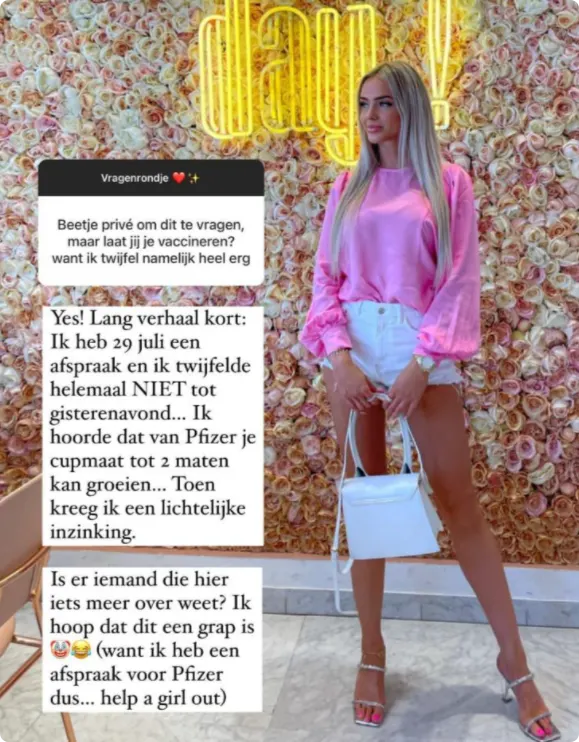Als een fan in een Q&A vraagt of Olivia zich laat vaccineren, zegt ze: "Yes! Lang verhaal kort: ik heb 29 juli een afspraak en ik twijfelde helemaal NIET tot gisterenavond. Ik hoorde dat van Pfizer je cupmaat tot 2 maten kan groeien."