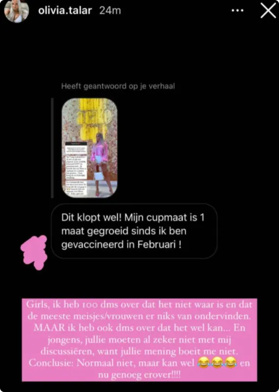 Haar volgers klimmen in de pen en eentje laat haar weten: "Dit klopt wel! Mijn cupmaat is 1 maat gegroeid sinds ik ben gevaccineerd in februari!"