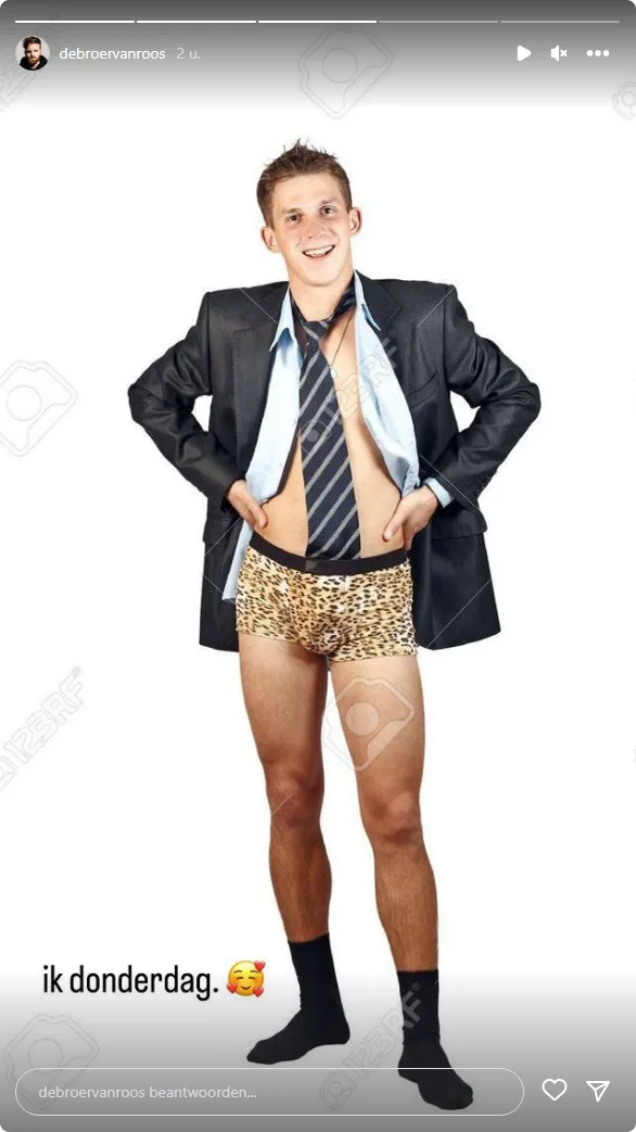 Alleen is maar de helft van de outfit geleverd, vervolgt Hofman. "Waardoor ik alleen een overhemd en schoenen heb (en de andere helft is kwijt)." Vervolgens deelt de presentator een foto van iemand die een overhemd, jasje en alleen een onderbroek draagt. "Ik donderdag", schrijft hij daarbij.