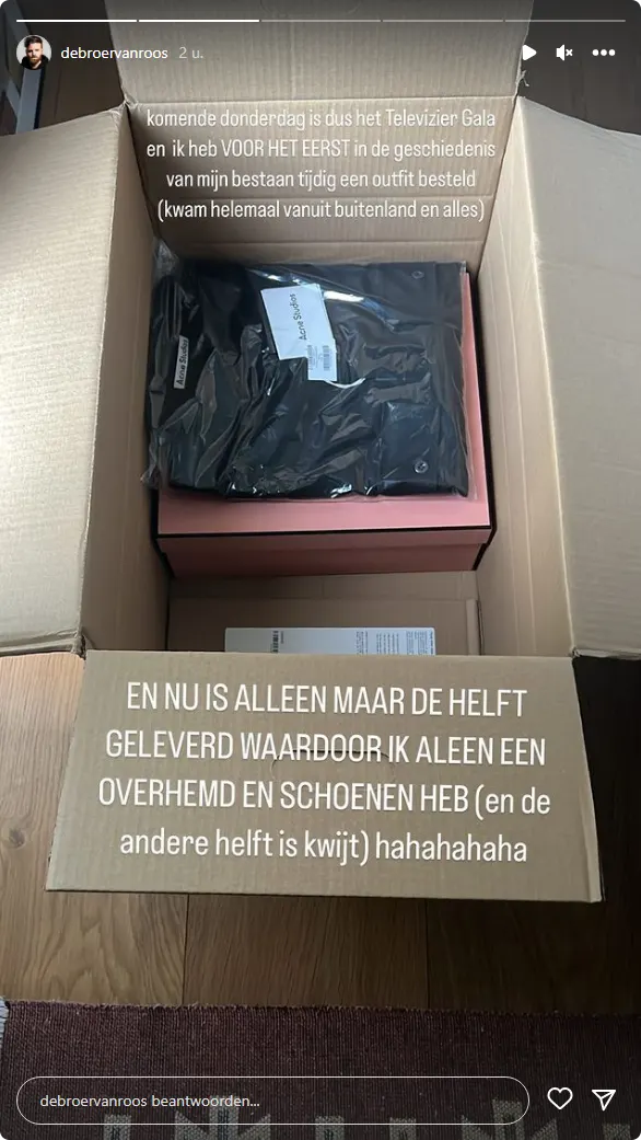 "Komende donderdag is dus het Televizier Gala en ik heb VOOR HET EERST in de geschiedenis van mijn bestaan tijdig een outfit besteld (kwam helemaal vanuit buitenland en alles)", schrijft de presentator bij een foto van een grote doos waarin een zwart pakketje ligt.