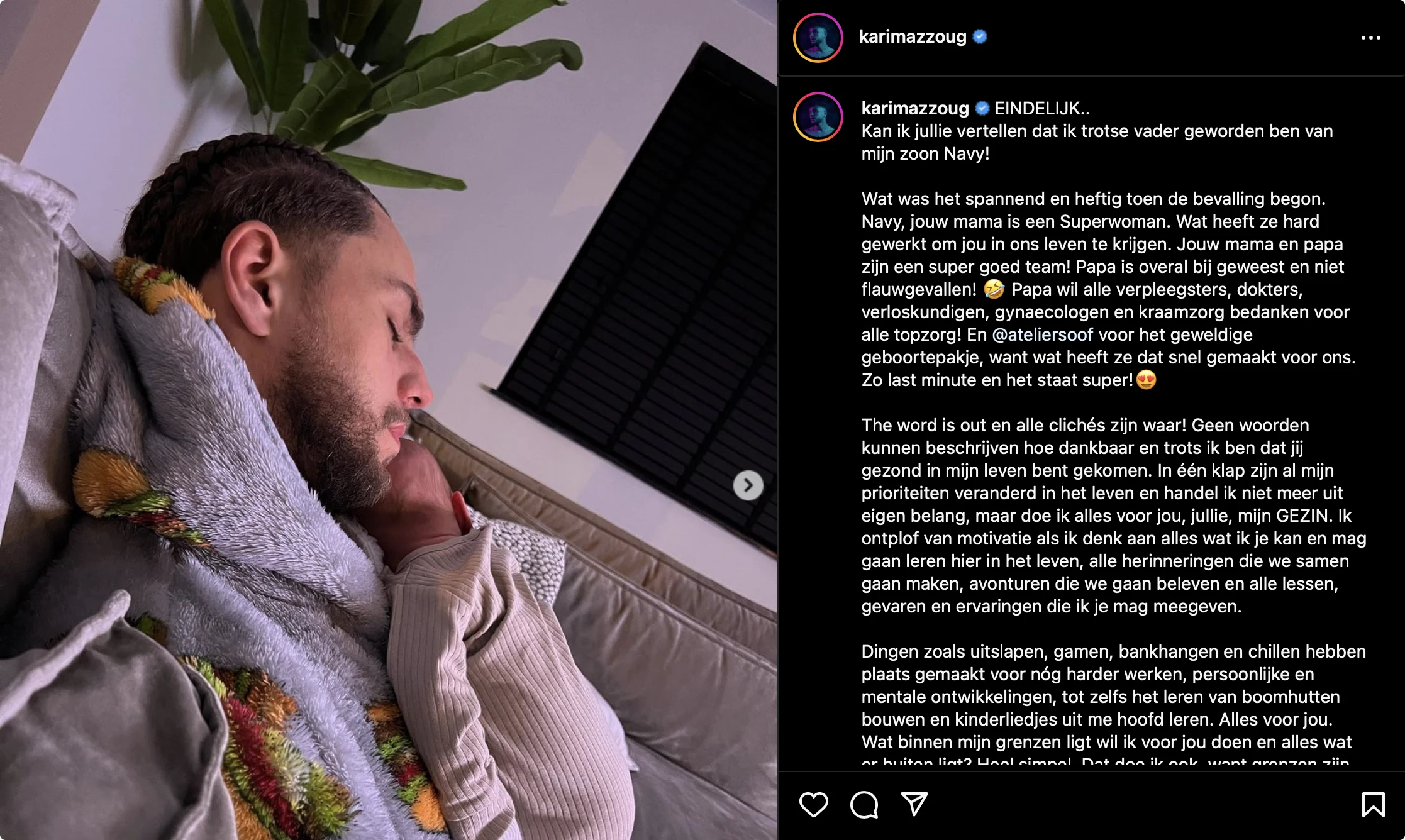 Deze week heeft Karim met zijn vriendin Amber zijn eerste kindje mogen verwelkomen. Via Instagram laat hij weten enorm trots te zijn.