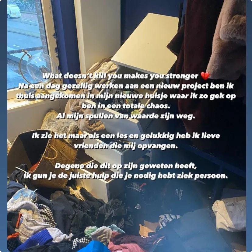Nadat Koen thuis kwam van een dag werken, trof hij zijn huis in een enorme rommel aan. Hij vertelt erover op Instagram: "Na een dag gezellig werken aan een nieuw project ben ik thuis aangekomen in mijn nieuwe huisje waar ik zo gek op ben in een totale chaos. Al mijn spullen van waarde zijn weg."