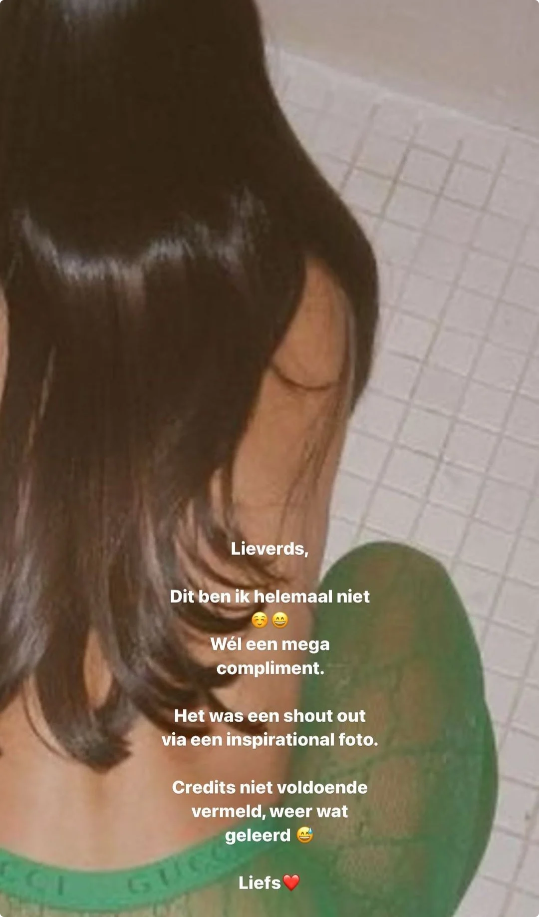Even later reageert Jaimie zelf op haar post en in haar Instagram Stories laat ze weten dat zij het helemaal niet is op de foto: "Lieverds, dit ben ik helemaal niet. Wél een mega-compliment. Het was een shout out via een inspirational foto. Credits niet voldoende vermeld, weer wat geleerd", schrijft ze.