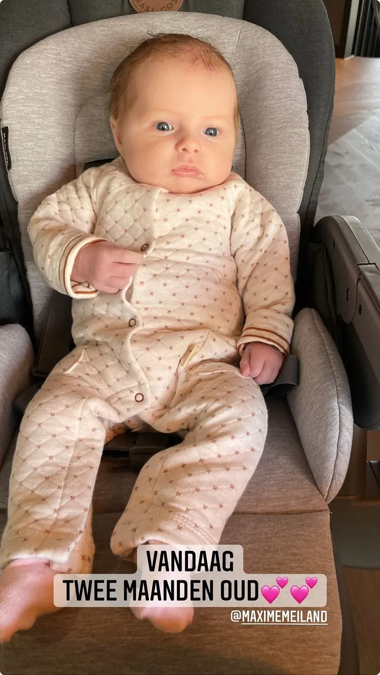 Zo deelt Leroy onderstaande foto van zijn dochtertje op zijn Instagram Stories, hij schrijft daarbij: "Vandaag twee maanden oud!" Ook Maxime deelt deze foto op het kanaal.