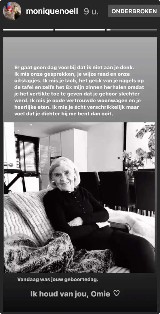 Oma Corrie zou vandaag 89 jaar zijn geworden. "Er gaat geen dag voorbij dat ik niet aan je denk. Ik mis onze gesprekken, je wijze raad en onze uitstapjes. Ik mis je lach, het getik van je nagels op de tafel en zelfs het 8x mijn zinnen herhalen omdat je het vertikte toe te geven dat je gehoor slechter werd. Ik mis je oude vertrouwde woonwagen en je heerlijke eten. Ik mis je écht verschrikkelijk, maar voel dat je dichter bij me bent dan ooit", aldus een emotionele Monique.