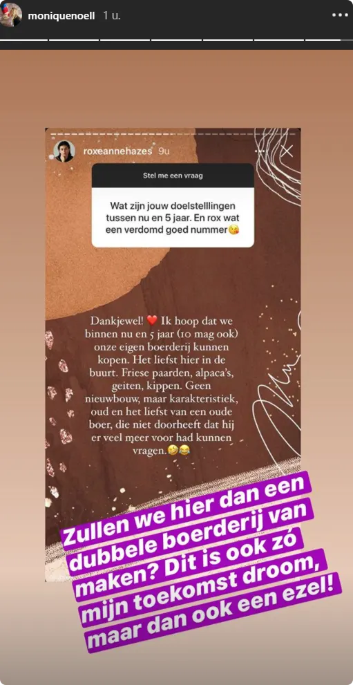 En zo blijkt ineens dat Roxeanne en haar schoonzus Monique, de vriendin van broertje André, een gezamenlijke droom hebben. "Zullen we hier dan een dubbele boerderij van maken? Dit is ook ZO mijn toekomstdroom", schrijft Monique in een reactie op Roxeanne's verhaal.