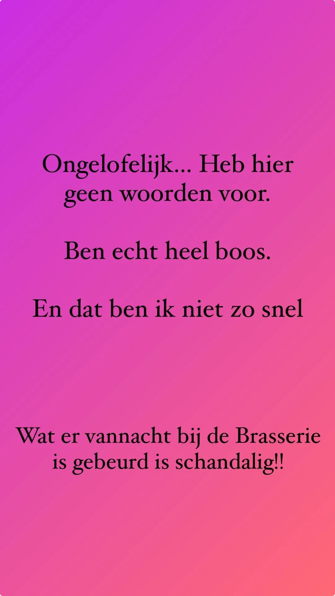 Nicolette van Dam is boos en dat laat ze weten op haar social media. "Wat er vannacht bij de brasserie is gebeurd is schandalig!"